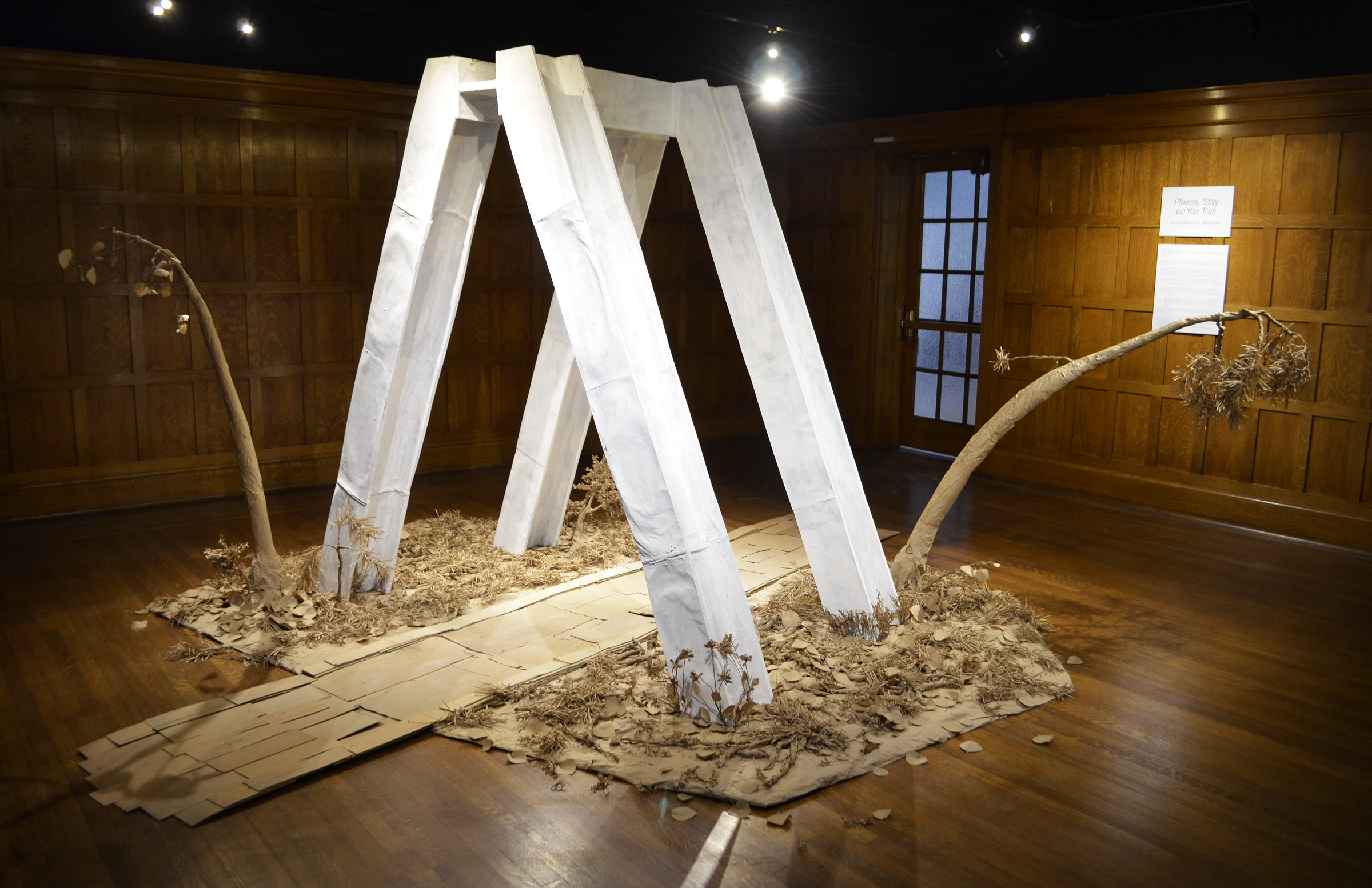 “Please, Stay on the Trail” is an installation, originally created during a summer residency at Yellowstone National Park, where viewers are welcome to interact with the constructed space. The I-beam structures are created from papier-maché and the organic forms are assembled from laser-cut paper.