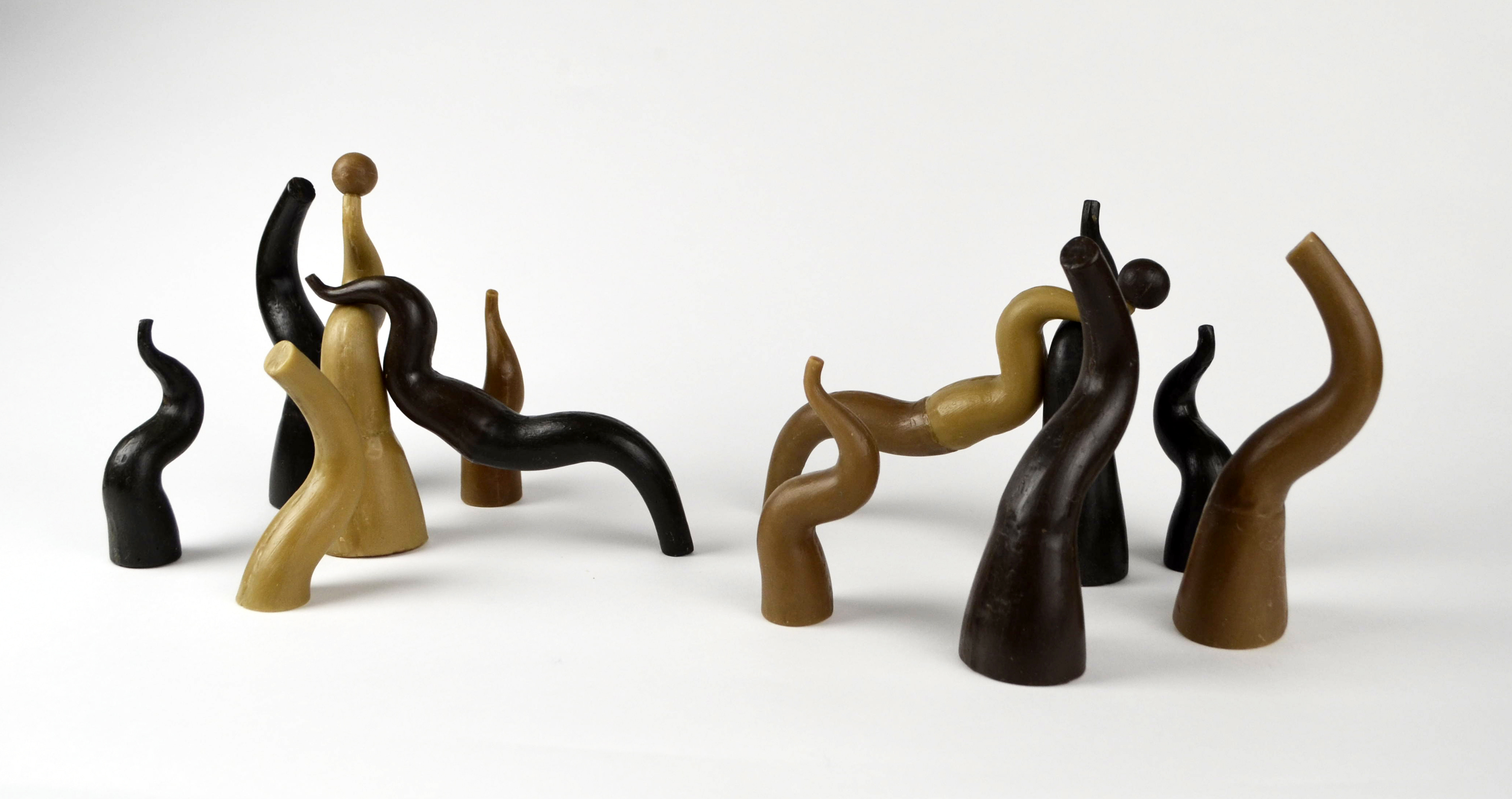 An assignment where students created a non-representational form digitally that was 3D printed, created plaster molds from the 3D prints, and then took multiple wax castings to create a larger composition.