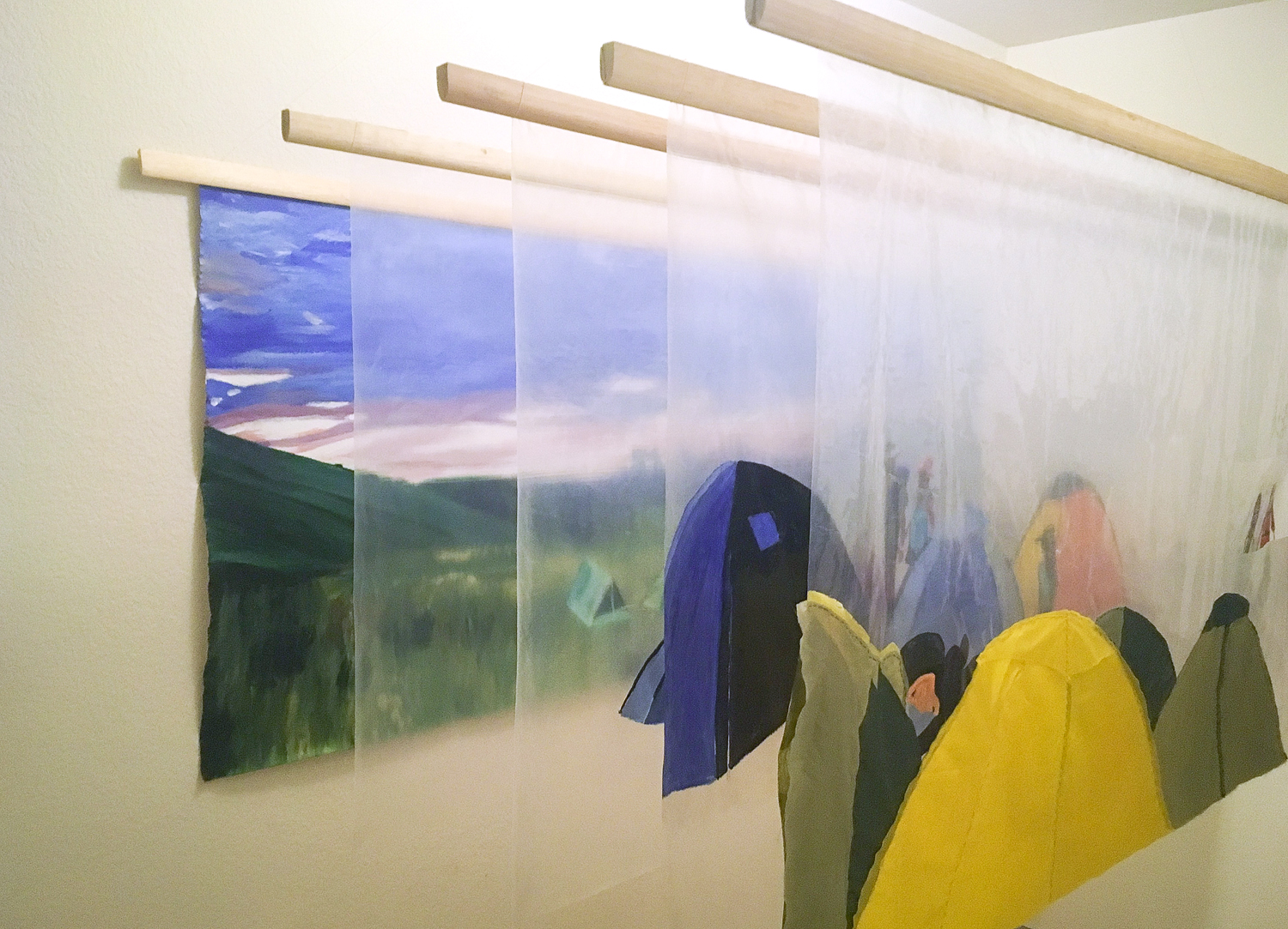 Plastic sheeting, wood, acrylic paint, and tent fabric