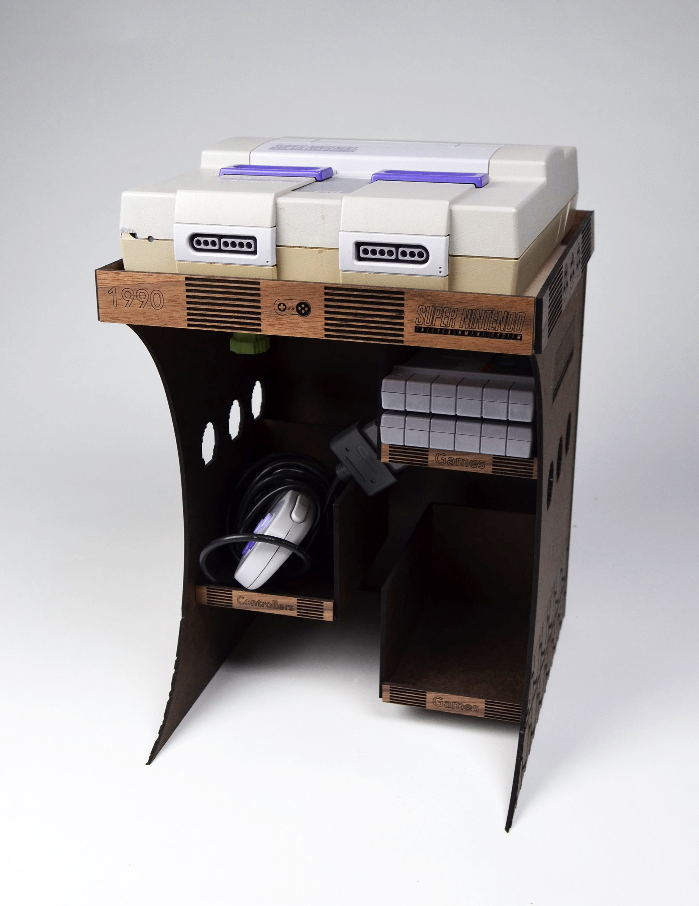 Laser-cut wood and mason board, wood glue, and Nintendo with accessories 10″ x 12″ x 16″ Fall 2019